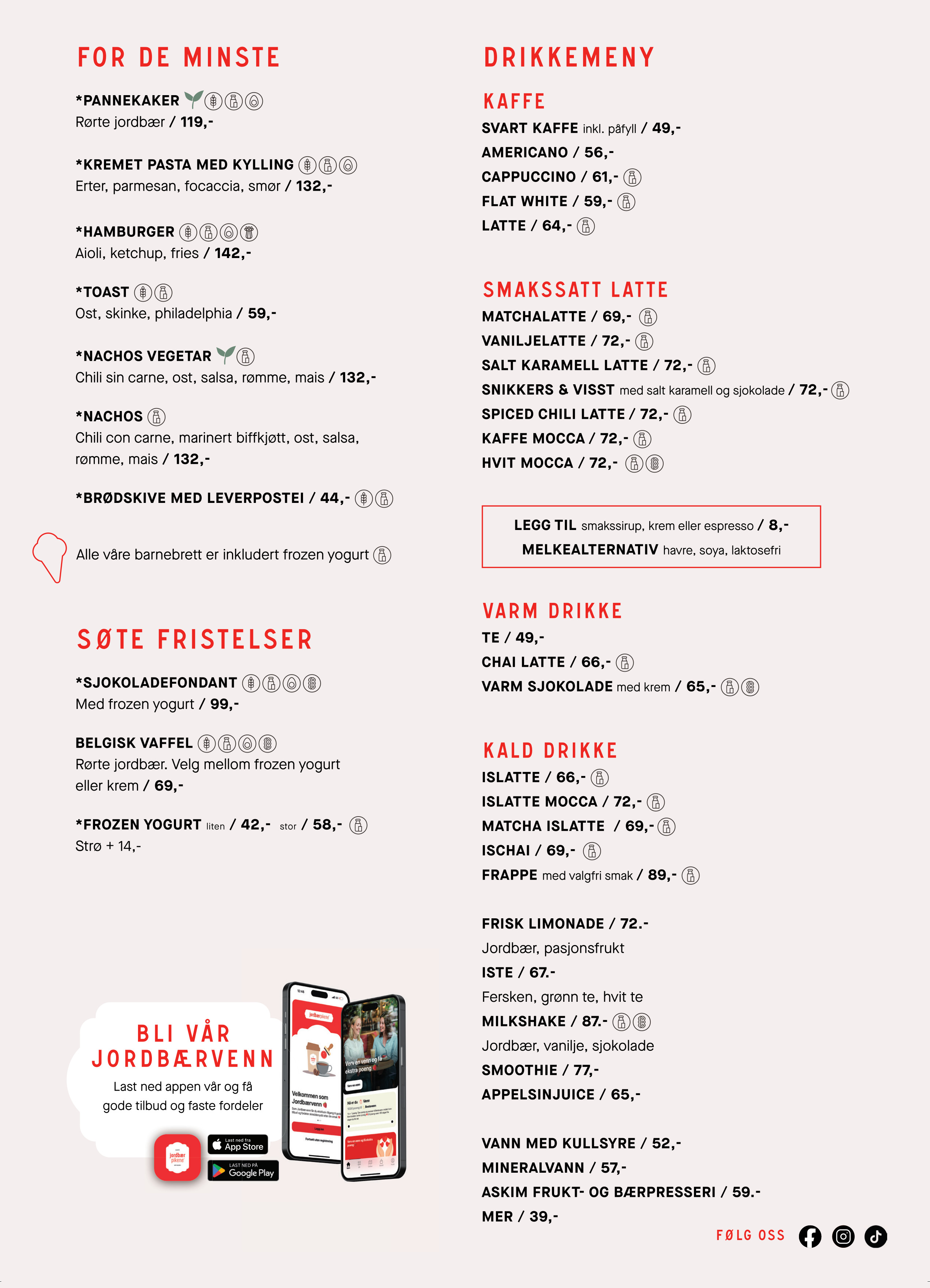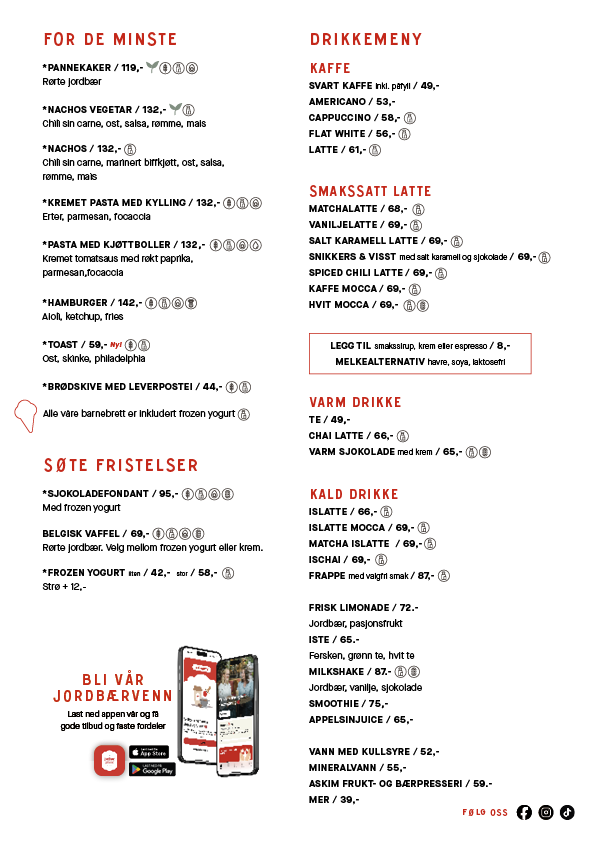 Vi serverer et raust utvalg av lunsj, varme retter og middag på Jordbærpikenes eget vis. Velg fra våre retter på hovedmenyen, eller se vår lokale disk og utvalg fra kakedisken.