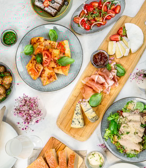 Vår Cæsarsalat, kyllingwrapruller, focacciapizza, tomatsalat, spansk omelett, spekeskinke, ostefat med tomatmarmelade, saltbakte poteter, brownie, focaccia og aioli.